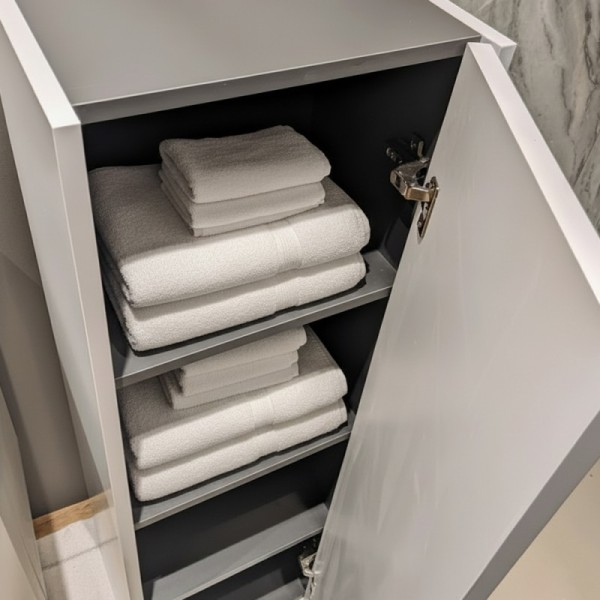 Elegante und funktionelle Hängeschranksäule mit Ablageflächen aus grauer Eiche, perfekt, um den Raum zu optimieren und Ihrem Bad Stil zu verleihen.