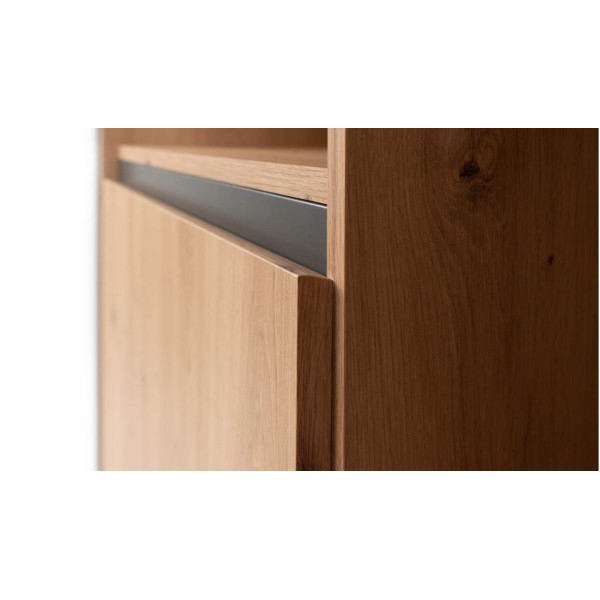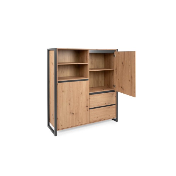 Sideboard 120x140h cm mit Türen und Schubladen in Eiche und Anthrazit - Denver 51Die Denver-Kollektion wurde geschaffen, um Wärme in Ihr Zuhause zu bringen. Die Kombination der Farben Eiche und Anthrazit ergibt moderne Möbel, die kaum aus der Mode kommen werden. Das hohe Sideboard Denver 51 besteht aus 2 Türen, 2 Schubladen und 2 offenen Fächern. Der Korpus, die Türen und das Innere des Schranks sind in Eiche ausgeführt, während die Profile und Details anthrazitfarben sind. Das Innere der Schubladen ist weiß. Im Inneren des Schranks befindet sich ein praktischer Einlegeboden. Eigenschaften: |