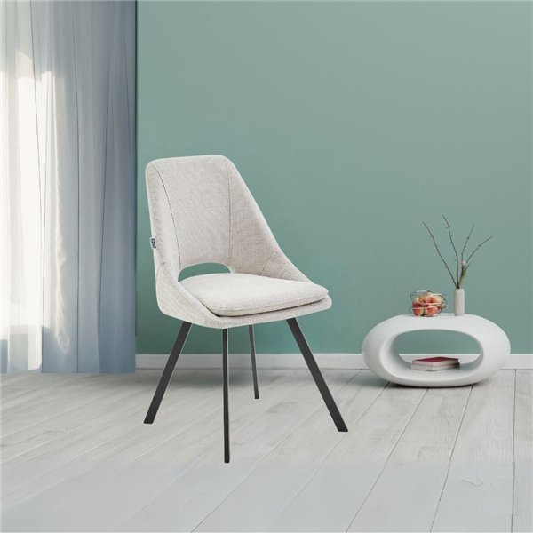 La sedia Blauss in tessuto salmone e gambe in metallo nero si caratterizza per il suo design moderno e per la sua comodità.