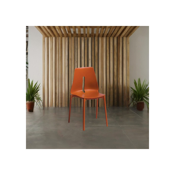 Moderner Stuhl aus ziegelrotem Polypropylen, langlebig und leicht. Perfekt für den Innen- und Außenbereich, ideal für die stilvolle Einrichtung von Terrassen, Gärten oder Esszimmern.
