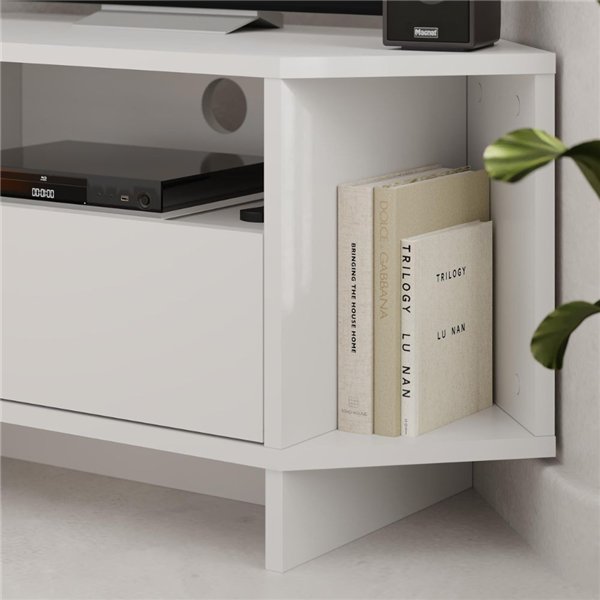 Der TV-Ständer Viva ist mit 1 Fach mit Klappe und 3 praktischen offenen Fächern ausgestattet. Die beste Art und Weise, Ordnung zu halten und alles in Reichweite zu haben.